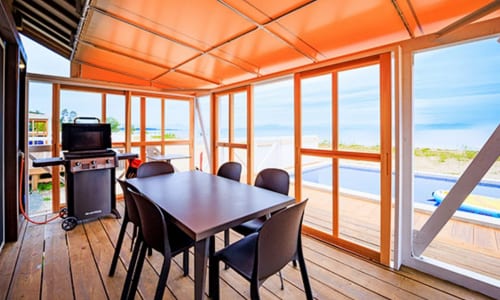 【GLAMP DOME 滋賀高島】和【湖畔露台琵琶湖】同樣位於滋賀縣高島市,共六套圓頂帳篷,並設有私人花園與露營營火。另外,在共用區的透明帳篷裡的夜間酒吧,有提供啤酒和飲料等無限暢飲服務。